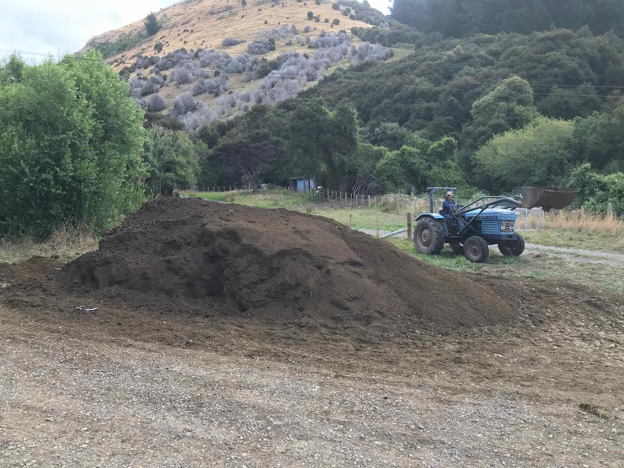 A great thing about living in a farming community is that there is a great supply of fertiliser close by. Several neighbours have recently had a huge vacuum cleaner suck all of the old sheep manure out from under their woolsheds. One neighbour called and offered me as much of the manure as I wanted. The texture of the manure is amazing, powdery and dry – very easy to shovel; and it smells great – not at all like fresh sheep poo! So, husband and I borrowed another neighbours trailer and headed over. Farmer neighbour let us use his tractor to load the truck and trailer, we unloaded it onto a large sheet of black plastic at home before repeating the process. Altogether, we took three truck and trailer loads – the final trailer load was for the owners of the trailer. It took about one hour to complete a single load. Then we covered it all with a blue tarpaulin so that it will stay dry and powdery until I am ready to cart it all to the vegetable garden and fruit trees.