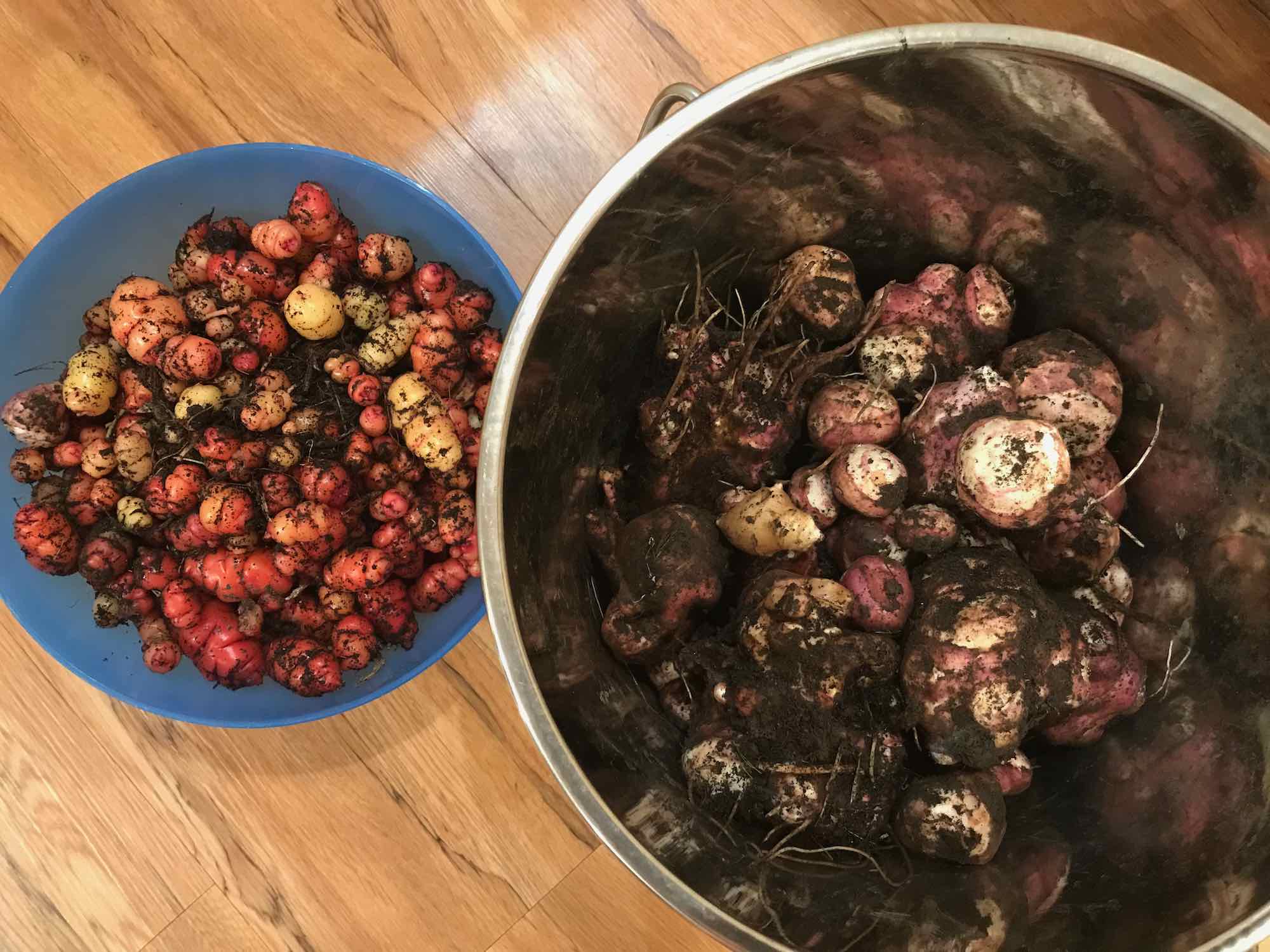 Over the last few days, I’ve cut back the Jerusalem artichokes. This was a much bigger task than I had anticipated! I did harvest 1/2 a bucket of artichokes from the path around the bed and a large bowl of New Zealand yams (oca – Oxalis tuberosa) from amongst the artichokes and asparagus.